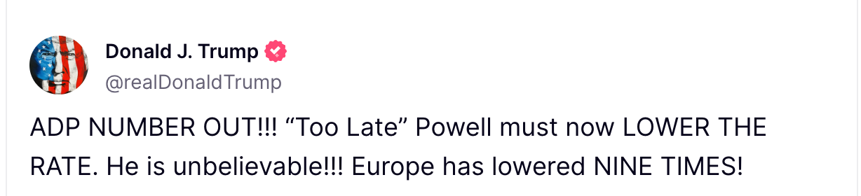 President Donald Trump renewed pressure on Federal Reserve Chair Jerome Powell to lower interest rates, citing a slowdown in job growth reported by payroll firm ADP.