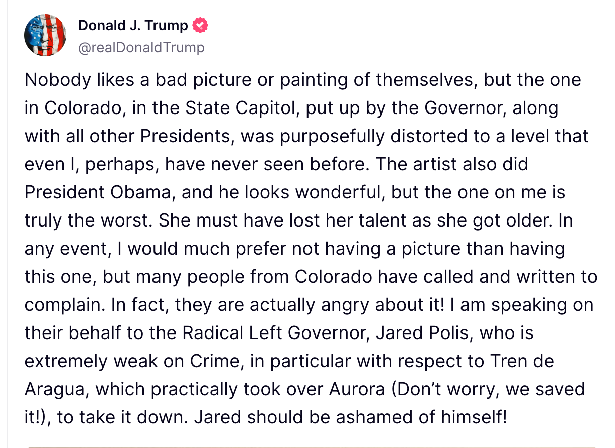 President Donald Trump criticized Colorado Governor Jared Polis over a portrait of him. In a Truth Social post, Trump accused Polis of promoting a "purposefully distorted" image, calling it the "truly worst" portrait of him he had seen.