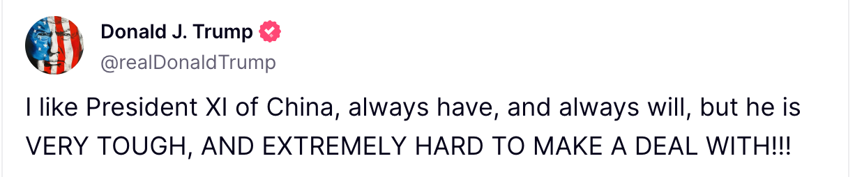 President Donald Trump on Wednesday called Chinese President Xi Jinping a “very tough” negotiator on social media platform Truth Social. “I like President Xi… but he is extremely hard to make a deal with,” Trump posted.