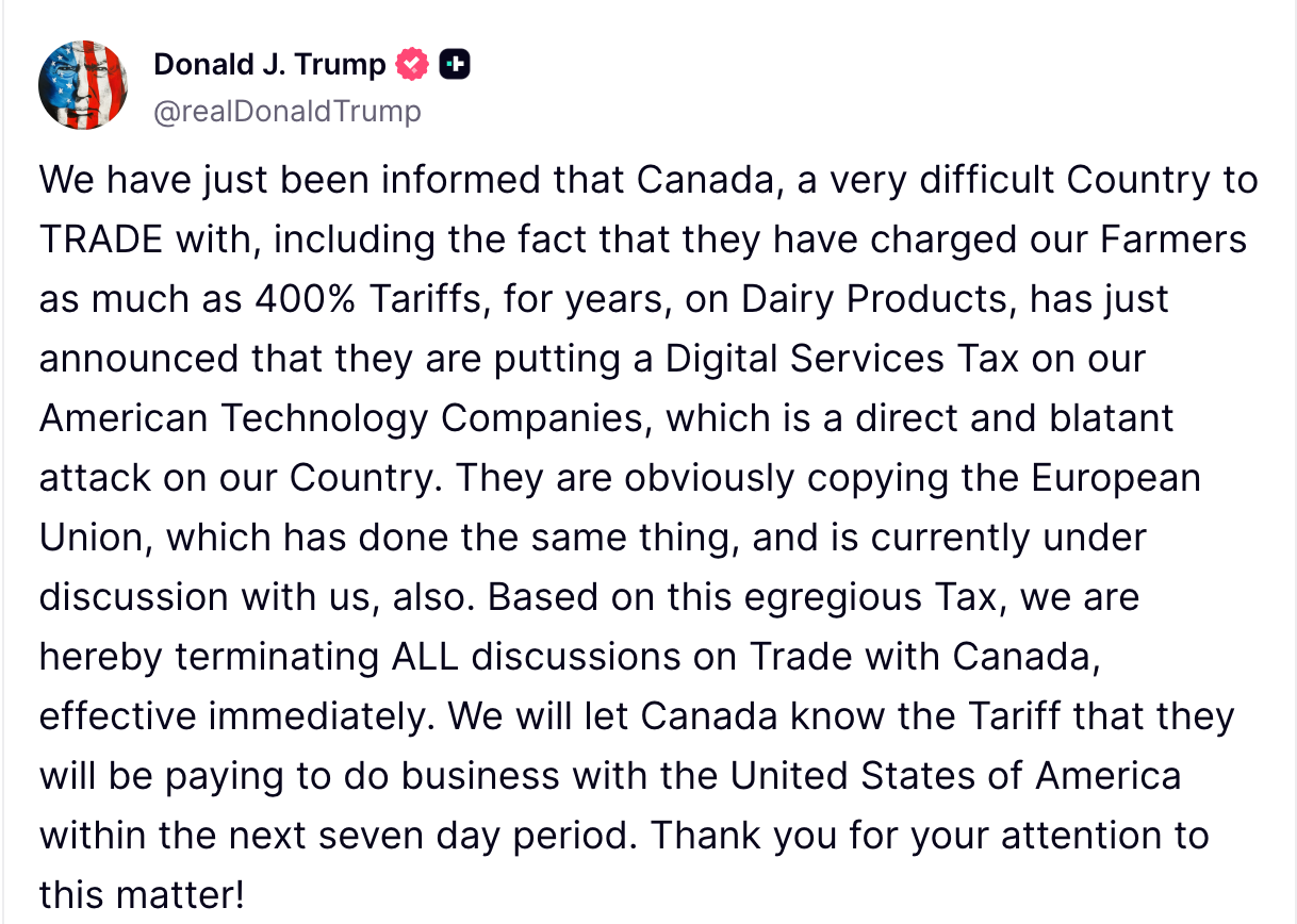 President Donald Trump announced Friday that the United States is terminating all trade discussions with Canada after learning of the country’s plan to impose a digital services tax targeting American technology companies.