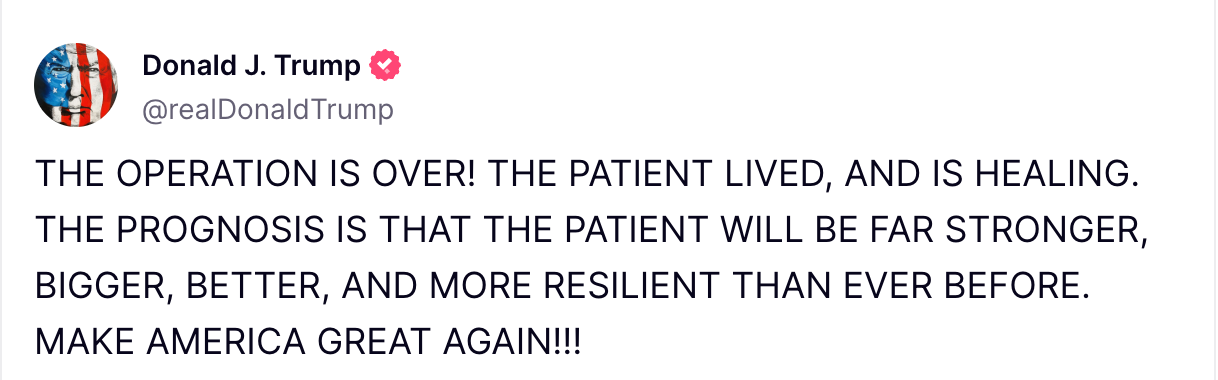 President Donald Trump posted on Truth Social this morning, making his first comment reflecting on recently made tariff announcements. "The operation is over! The patient lived, and is healing. The prognosis is that the patient will be far stronger, bigger, better and more resilient than ever before," he wrote.