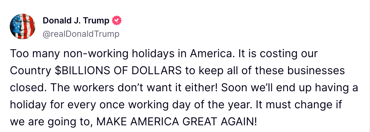 Instead, he posted on Truth Social without naming the holiday, saying there are “too many non-working holidays” that are “costing our country billions of dollars to keep all of these businesses closed.”