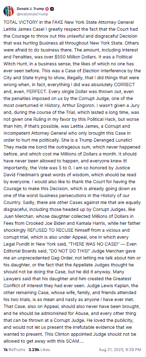 In a lengthy post on Truth Social, Trump blasted New York Attorney General Letitia James, calling the case a “political witch hunt” and “election interference.”