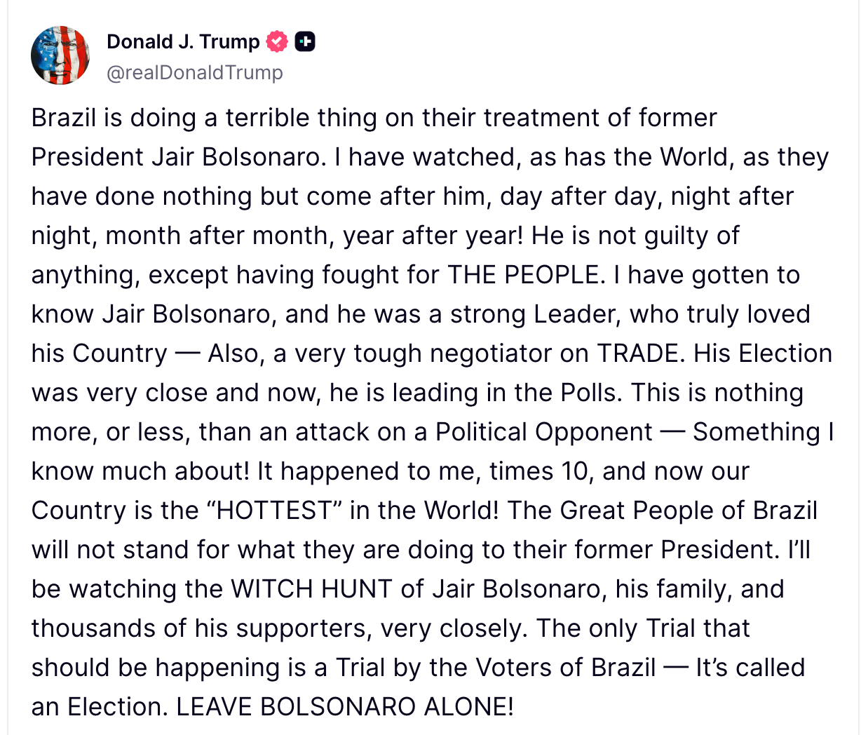 In his post, Trump criticized Brazil’s judiciary, claiming Bolsonaro was being unfairly targeted. “Brazil is doing a terrible thing on their treatment of former President Jair Bolsonaro,” Trump wrote. “He is not guilty of anything, except having fought for the people.”