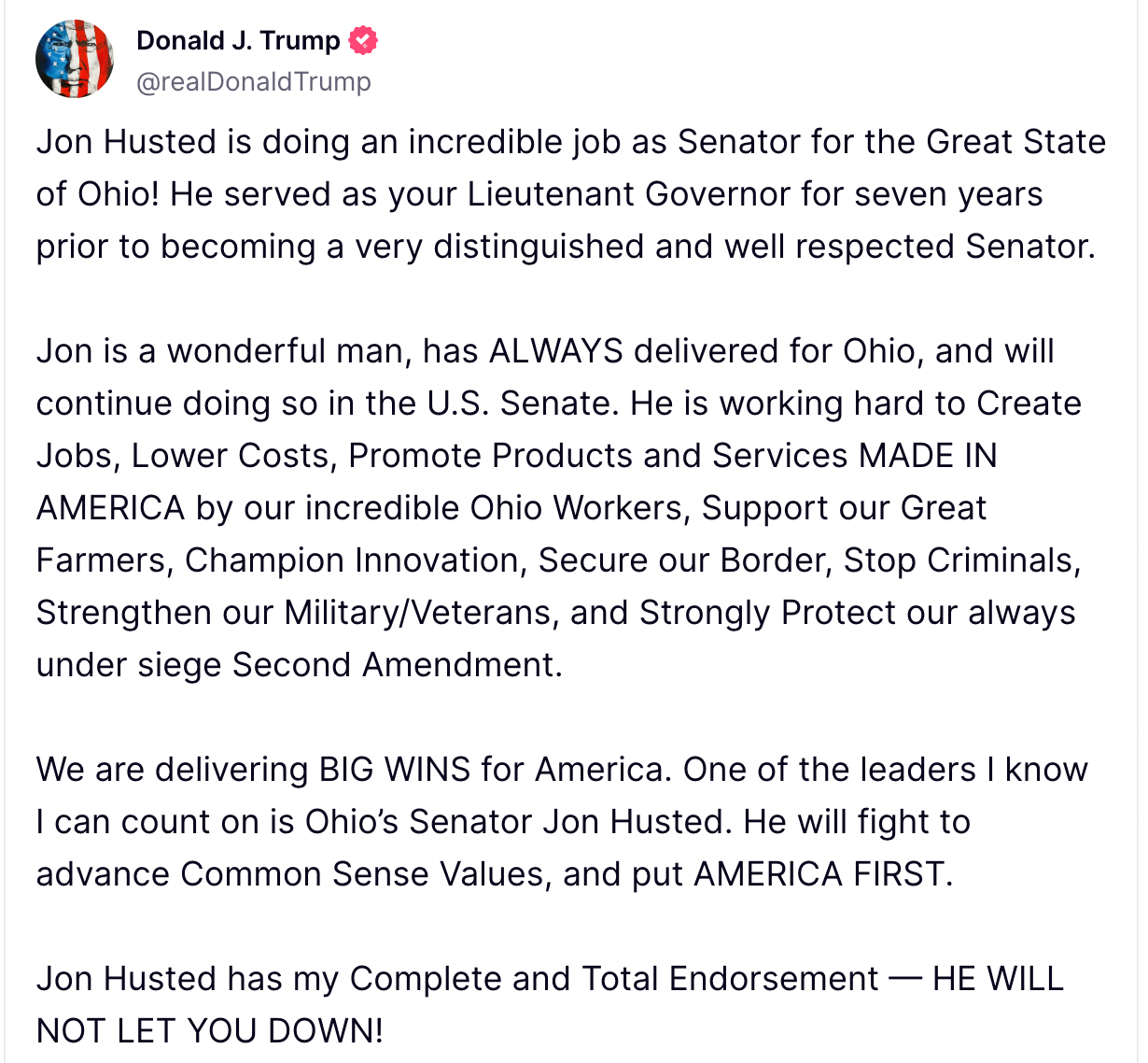 Trump also commended Husted’s commitment to strengthening the military and veterans’ rights. “Jon Husted has always delivered for Ohio,” Trump said, adding that Husted will continue to fight for common-sense values and put America first. The President expressed confidence in Husted’s leadership, declaring, “He will not let you down,” and reaffirmed his complete and total endorsement for the Senator’s re-election campaign.
