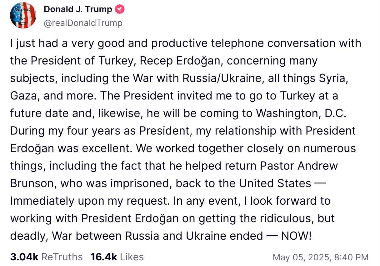 In a Truth Social post, Trump said Erdoğan invited him to visit Turkey “at a future date” and would also come to Washington. “During my four years as President, my relationship with President Erdoğan was excellent,” Trump wrote. “I look forward to working with him on getting the ridiculous, but deadly, War between Russia and Ukraine.
