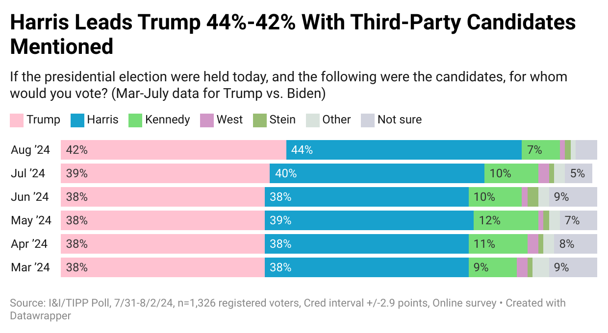 The I&I/TIPP Poll followed up its head-to-head question with one about presidential preference, this time with third-party and independent candidates also tossed in.