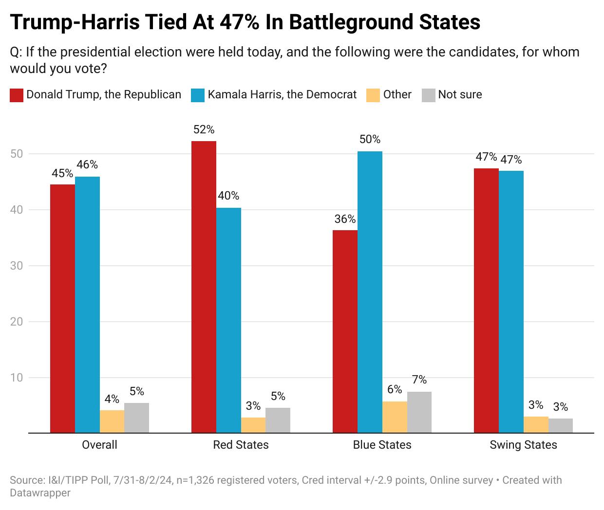 In the head-to-head poll, 46% of all respondents answered “Kamala Harris,” and 45% answered “Donald Trump.” The margin of error in the poll is +/-2.9 percentage points, making the presidential race at this point too close to call, at least by the numbers. The online national poll was taken from among 1,326 registered voters from July 31-Aug. 2.