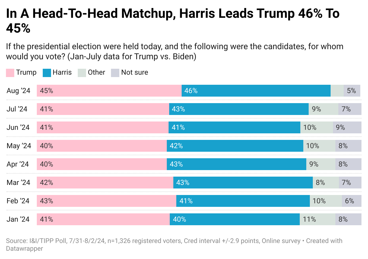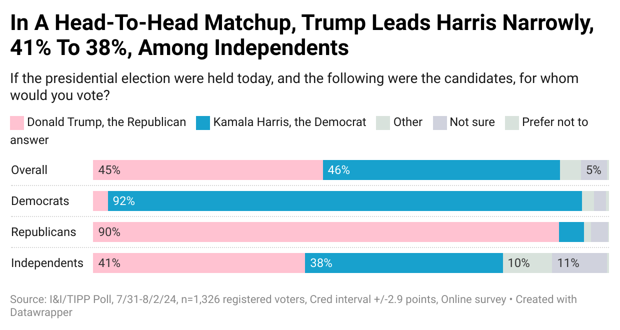Now that the Democratic Party officials have decided that Vice President Kamala Harris, and not primary-winner President Joe Biden or anyone else, will be their nominee, how will she fare against former President Donald Trump? Right now, the contest is a tossup, the latest I&I/TIPP Poll shows.