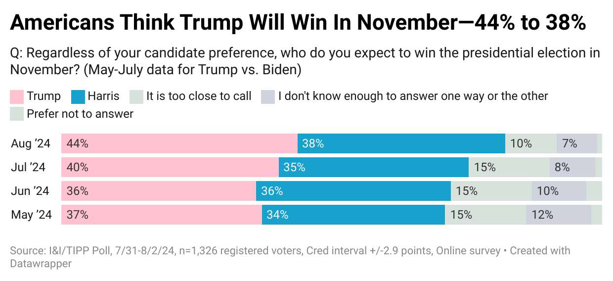 Note also that the share of voters who think Trump will win has been rising since the question was first asked in May. While the switch from Biden to Harris seems to have boosted the Democratic share a bit, from 38% for Harris from 35% last month for Biden, a hefty 44% now think Trump will win. That’s compared to just 36% as recently as June.
