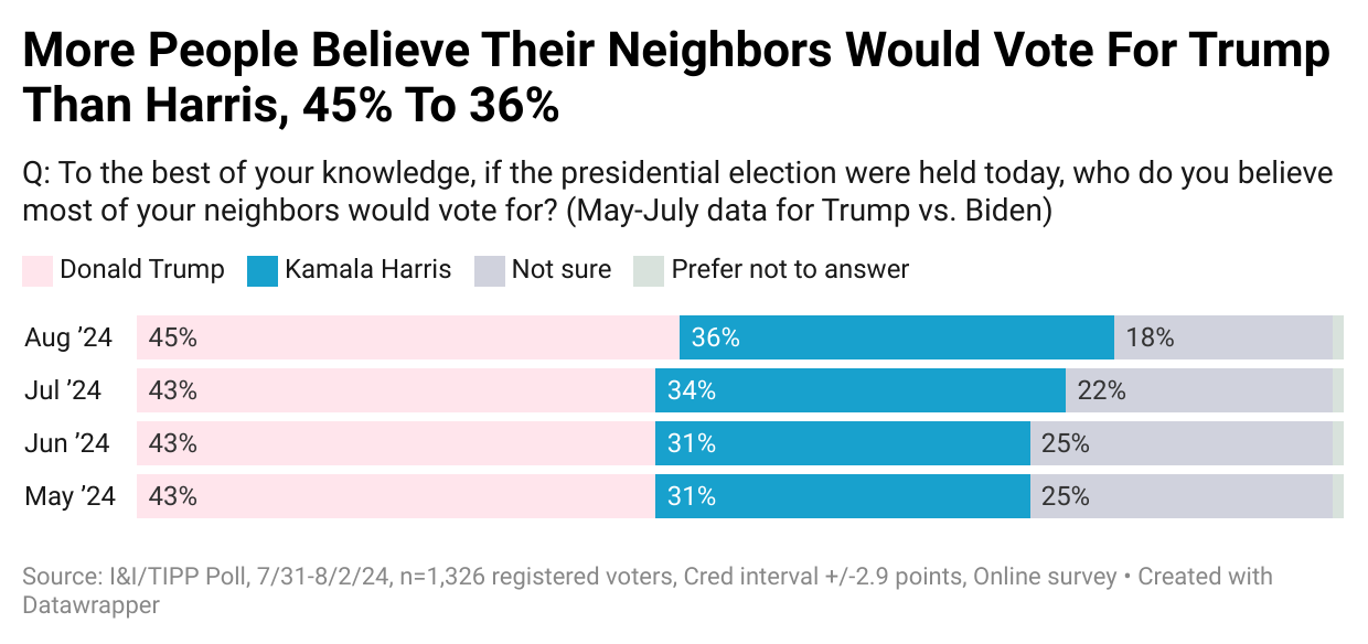 In a similar vein, I&I/TIPP asked voters whom they believed their neighbors would vote for, another indicator perhaps of quiet support at the local level. There again, Trump has a significant nine-percentage-point lead.