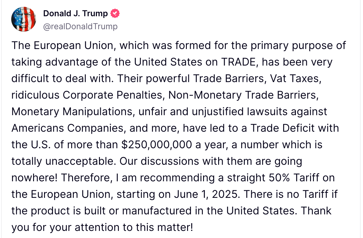 US President Trump’s suggestion today that he is recommending a 50% tariff on EU imports from 1 June is enormously disappointing.