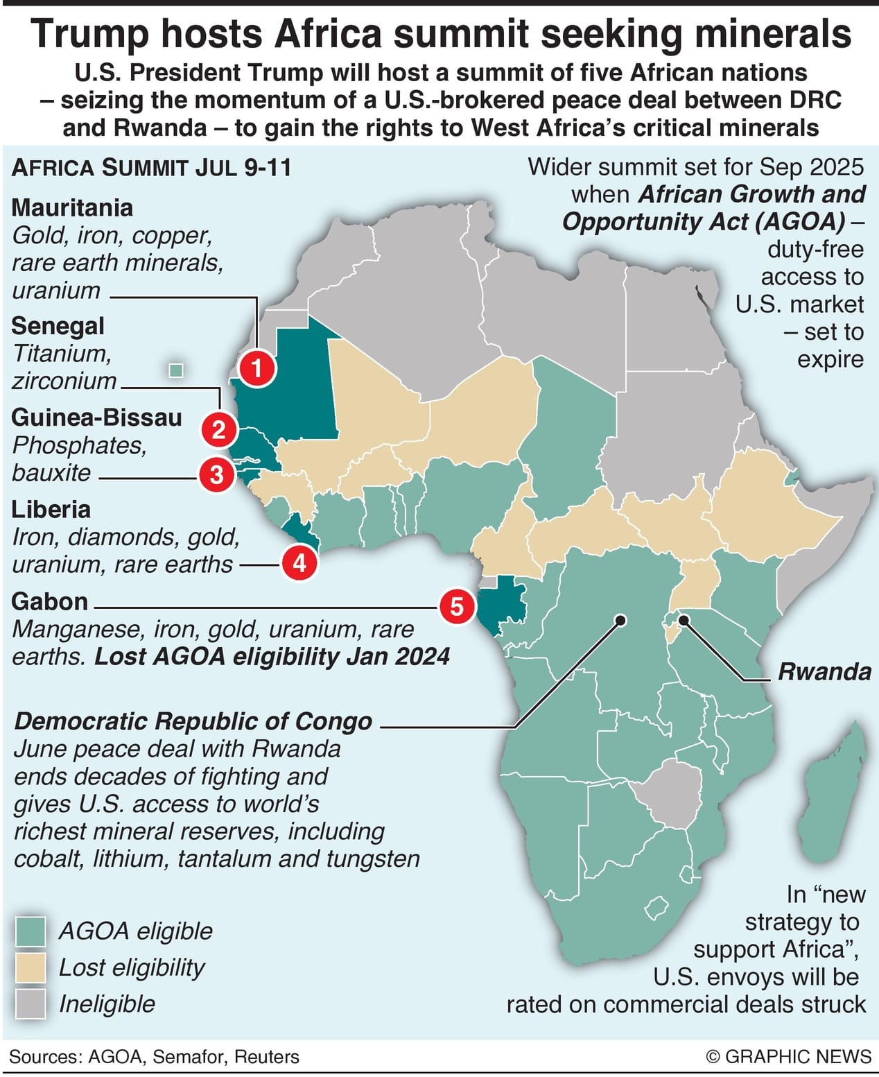 July 9, 2024 - July 11, 2025 - President Trump will host a summit of five African nations, seizing the momentum of a U.S.-brokered peace deal between DRC and Rwanda, to gain the rights to West Africa’s critical minerals.