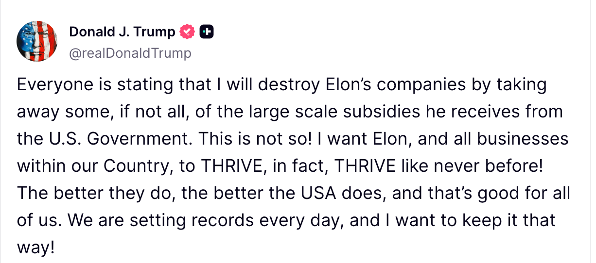 “Everyone is stating that I will destroy Elon’s companies by taking away some, if not all, of the large-scale subsidies he receives from the U.S. Government. This is not so!” Trump wrote on Truth Social. “I want Elon, and all businesses within our Country, to thrive.”