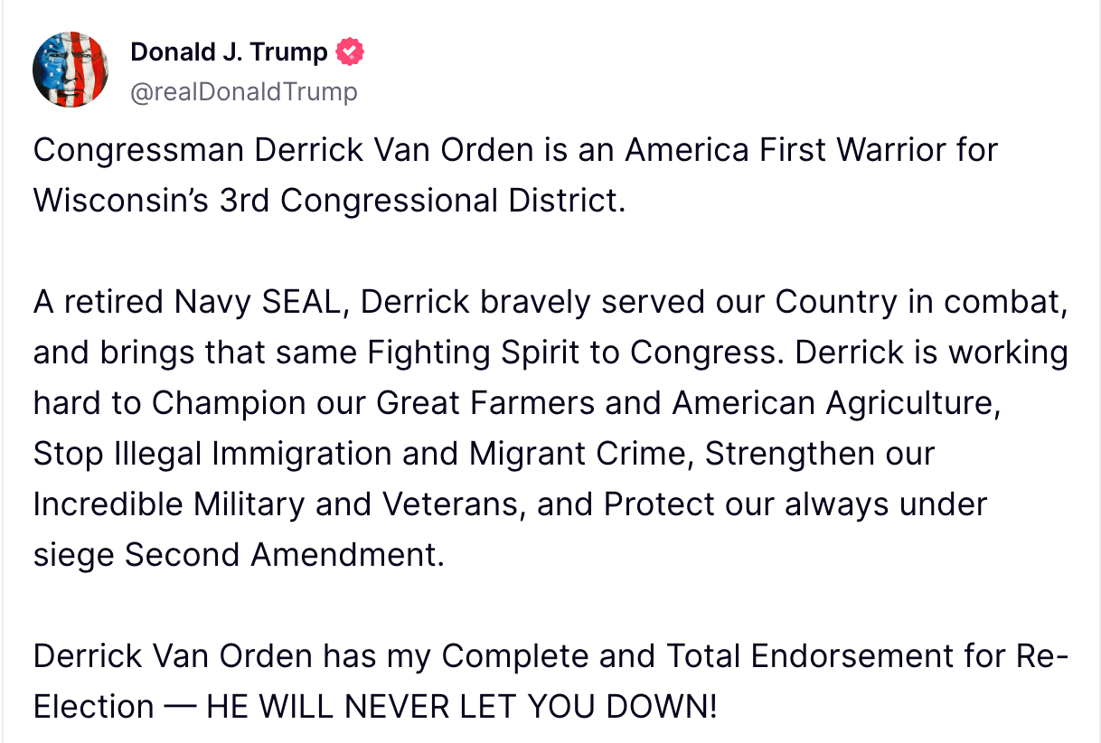 President Donald Trump issued a series of emphatic endorsements Monday for four Republican congressmen, calling them “America First” warriors who are key allies in his administration. In posts on Truth Social, Trump praised Rep. Derrick Van Orden (WI-3), a retired Navy SEAL, for his support of farmers, the military, and the Second Amendment. He called Rep. Juan Ciscomani (AZ-6) a “tremendous champion” on the powerful Appropriations Committee, highlighting his efforts to secure the border and fight migrant crime.