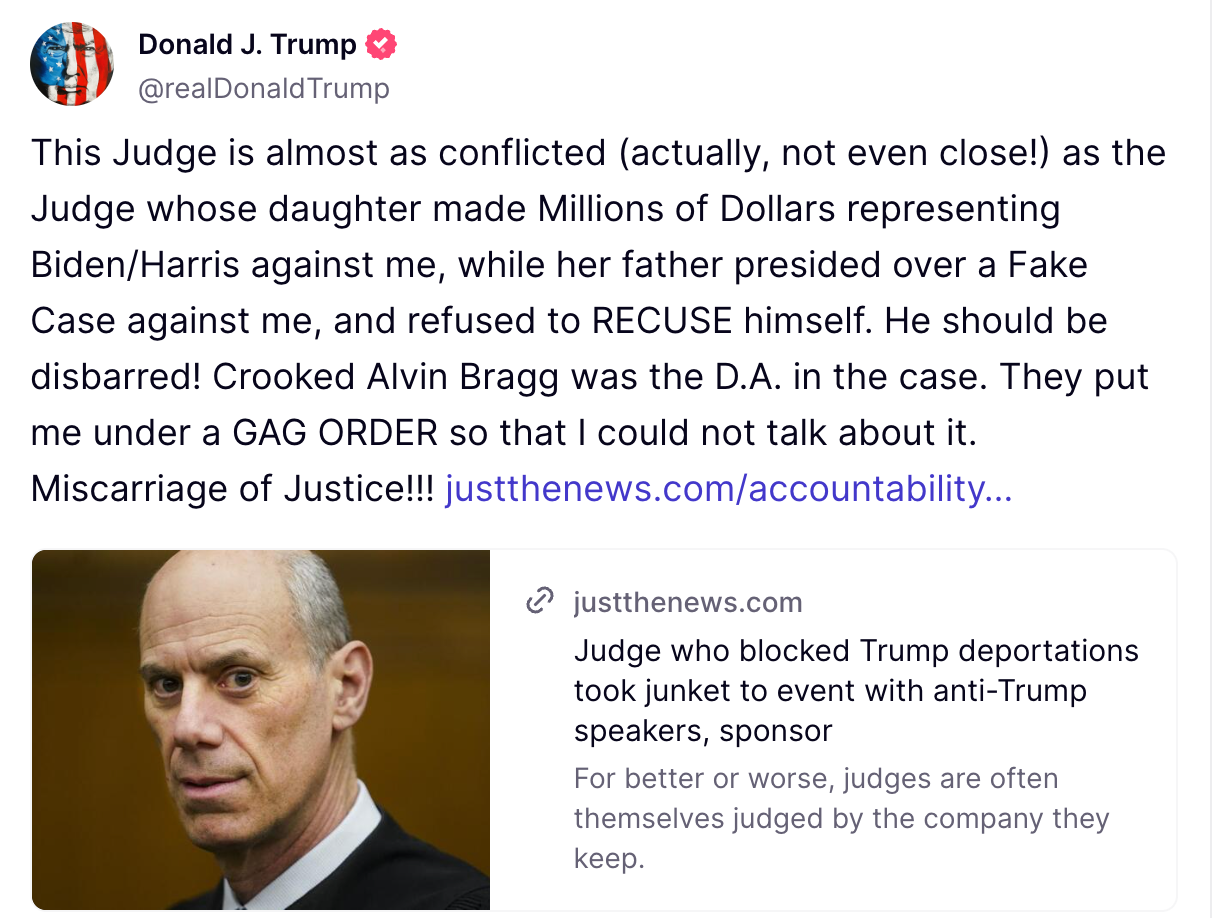Trump launched a fresh attack on U.S. District Judge James Boasberg, comparing him to New York Judge Juan Merchan, who oversaw Trump’s hush money case. He criticized Boasberg after a report revealed he attended a legal conference with judges and speakers, some of whom were reportedly hostile to Trump’s immigration policies.