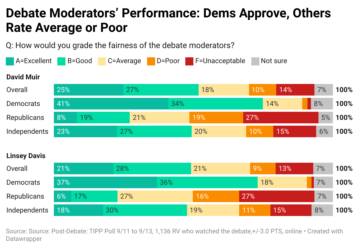 When Trump said that Democrats had supported policies that allow fetuses coming near to term to be killed, Davis fact-checked Trump. But Raddatz pointed out that nine states, including Washington D.C., have no restrictions on abortions whatsoever. Regarding military deployments, Harris said at the debate that American active-duty military personnel are not in any combat zone anywhere, a record for any president. This, too, was a lie. Raddatz pointed out that over 2,500 troops in Iraq and 900 in Syria are serving, often under grave danger. If the debate moderators had fact-checked Harris live, the media could not have engaged in their narrative that she won the debate - and that a post-debate poll bounce was to be expected.