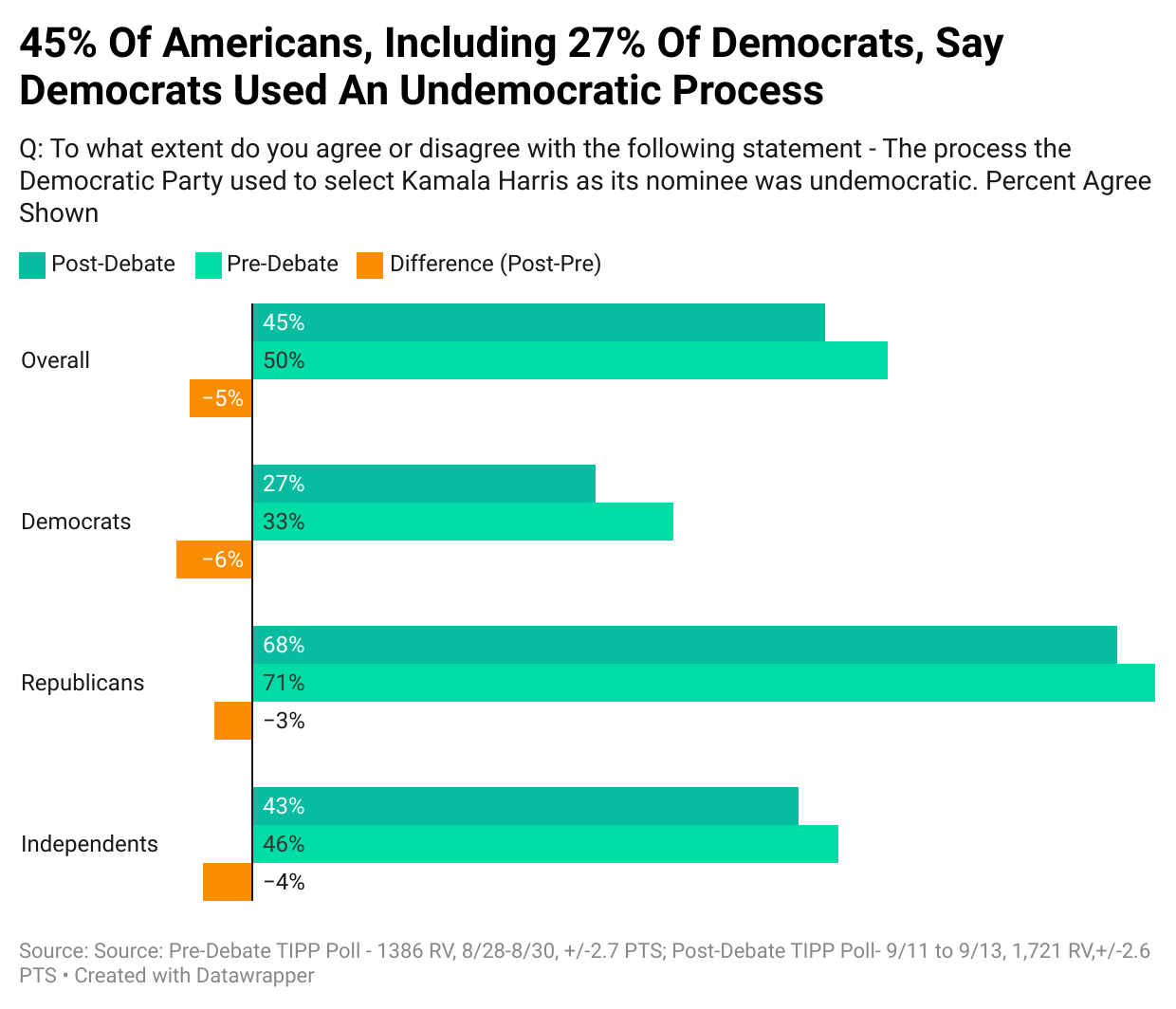 While a sizable member of the Democratic coalition in our latest TIPP Poll disagreed with how Biden was replaced by Harris, as a practical matter, the question before us is whether those disgruntled Democrats will vote for Trump or Harris. The unforced errors of the Trump campaign and Harris's joyful campaign aided by the media have forced Democrats to stay in the Harris camp. This is why Harris is leading in the national polls and breaking even with Trump in the battleground states.