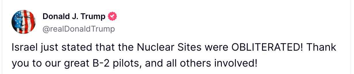 “The nuclear sites were obliterated,” Trump wrote on Truth Social, thanking U.S. B-2 bomber pilots for their role in the operation. His remarks followed a statement from Netanyahu’s office, citing the Israel Atomic Energy Commission, which said the U.S. strike on the Fordow enrichment site “destroyed the site's critical infrastructure and rendered the enrichment facility inoperable.”