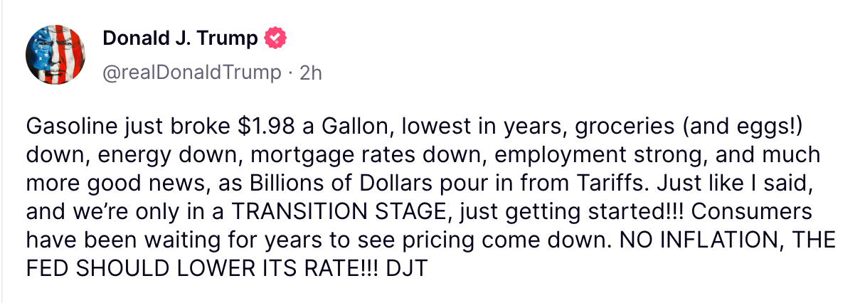 Trump highlighted falling gasoline prices, cheaper groceries, and lower mortgage rates as signs of progress, while repeating his call for the Federal Reserve to cut interest rates. “No inflation, Fed should lower its rate," he declared.