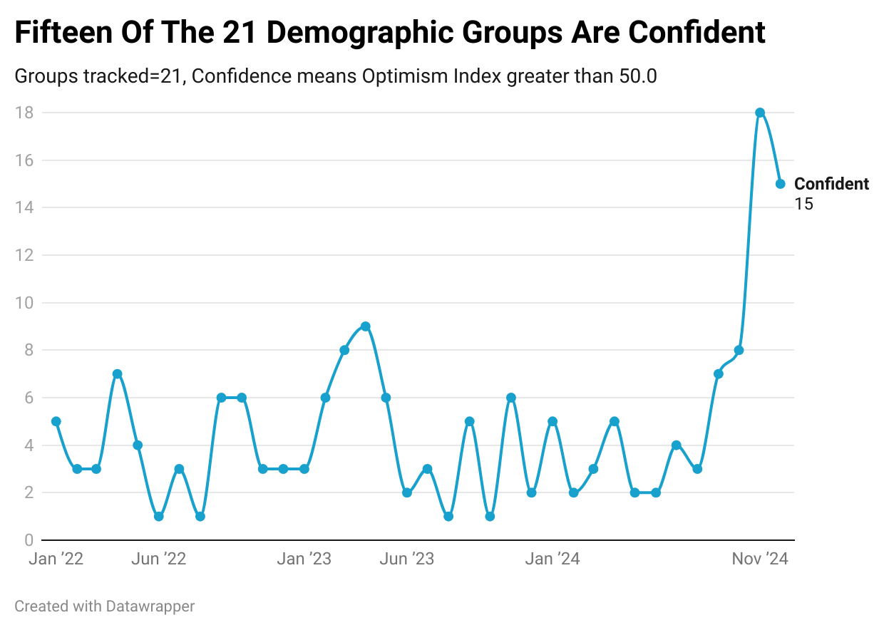 The number of groups in the positive zone indicates the breadth of optimism in American society. This month, demographic groups in the optimism zone fell from 18 in October to 15. In the immediate aftermath of the election, it had jumped from eight in October to 18 in November, indicating widespread optimism.