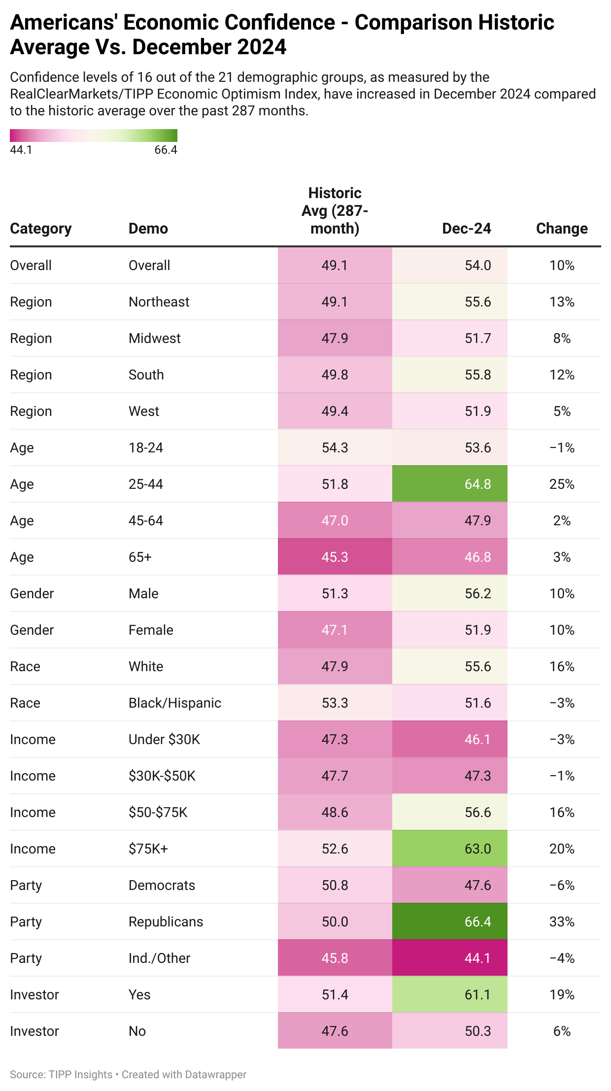 Economic optimism levels for 16 of 21 demographic groups are higher in December 2024 than the historical average of the past 287 months.