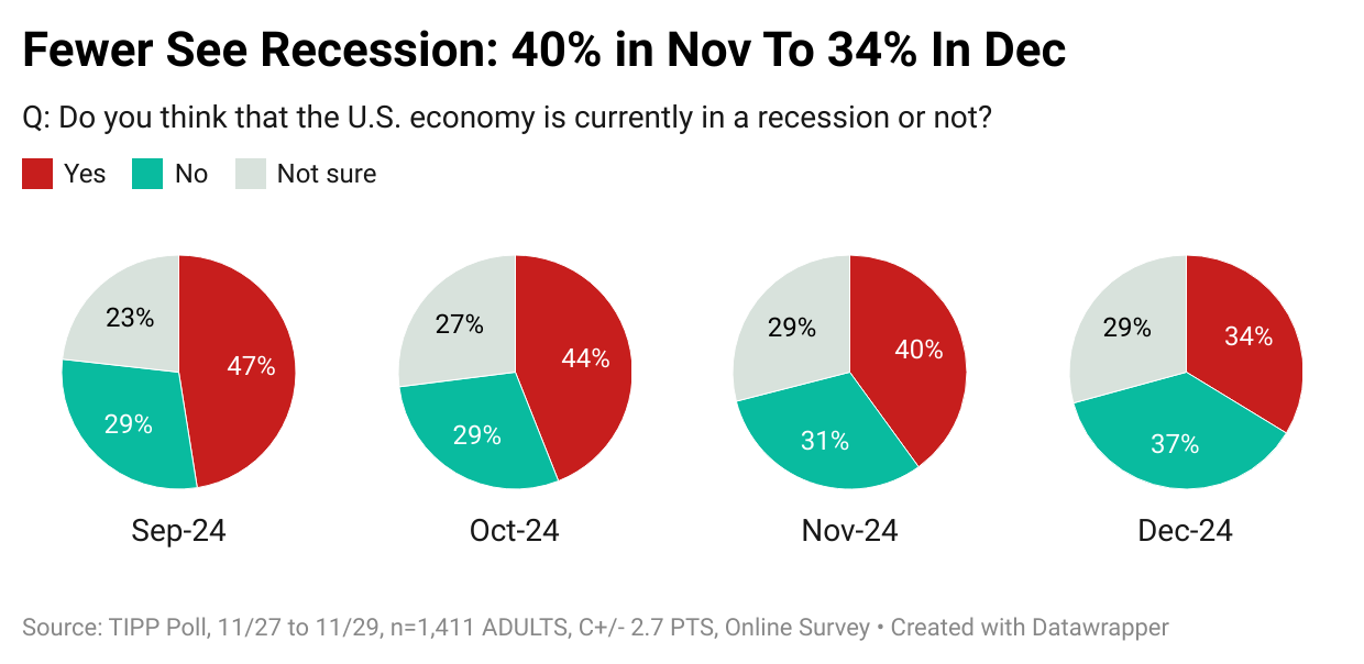 One-third (34%) believe we are in a recession, while 37% think we are not. Another 29% are not sure. The share of Americans who think we're in a recession has dropped from 47% in September to 34% in December.