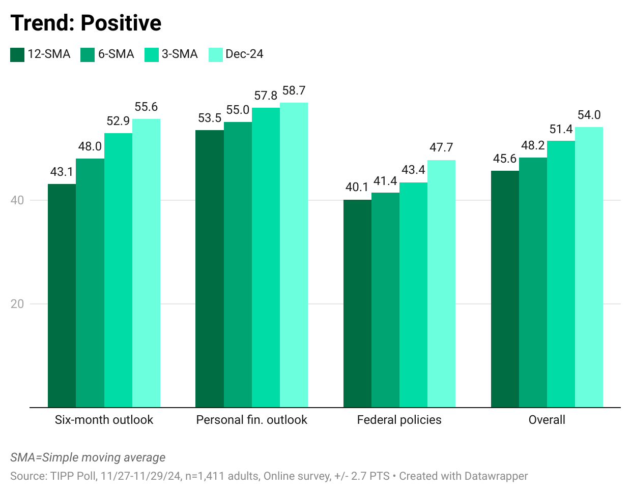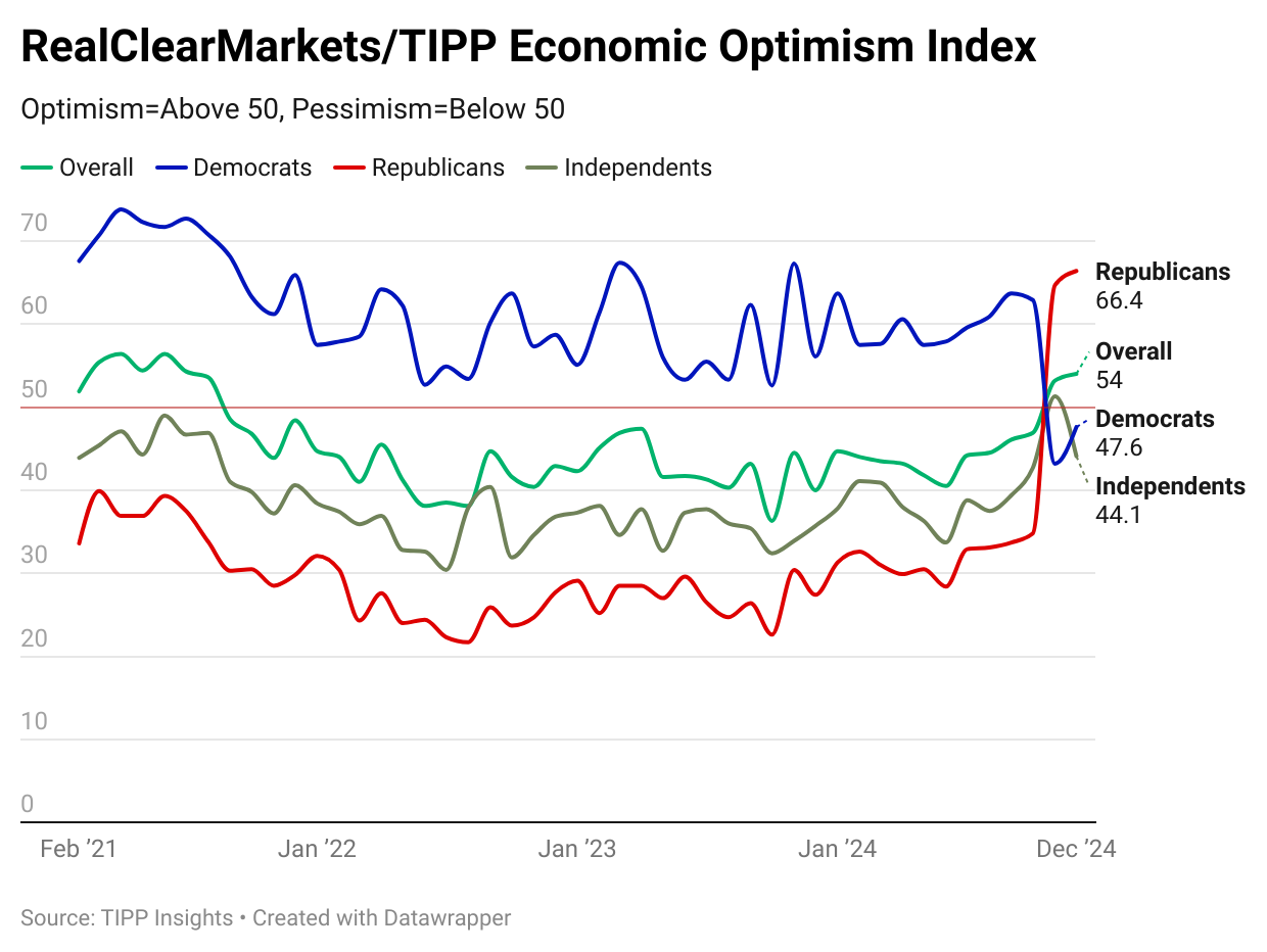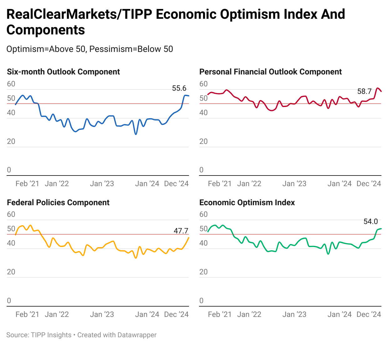 The RealClearMarkets/TIPP Economic Optimism Index, a leading gauge of consumer sentiment, rose by 1.5% in December to 54.0, reaching its highest level in 40 months since August 2021 (53.6). The Index had been in negative territory for 38 consecutive months, starting in September 2021, and broke out decisively in November after President Donald Trump's historic return as the 47th President.
