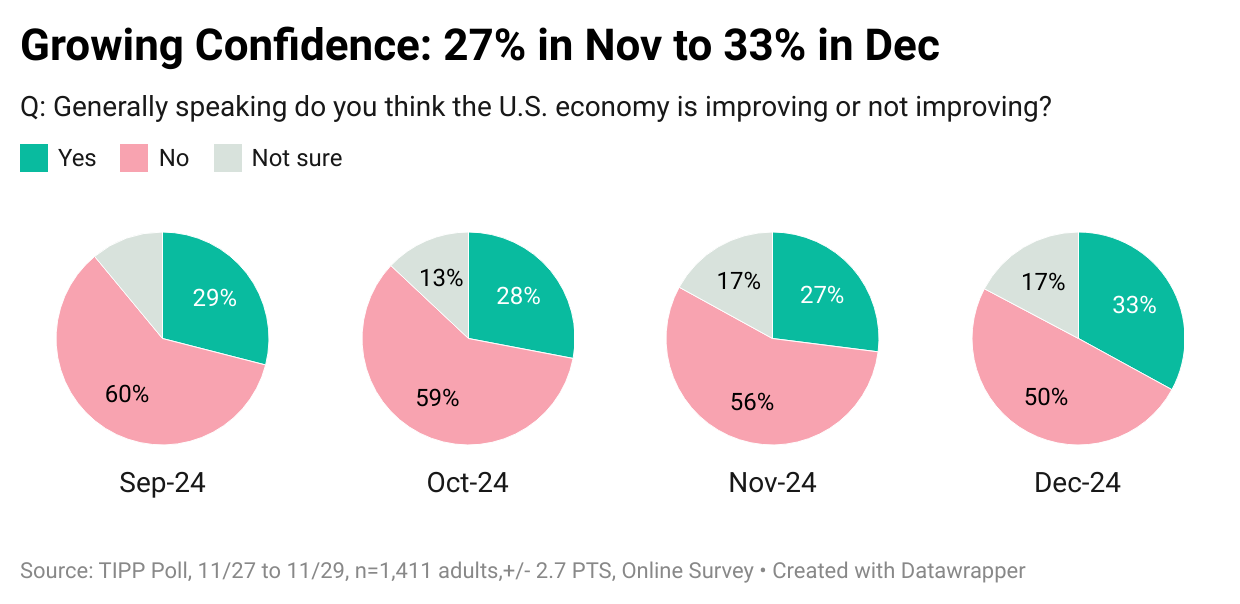 Meanwhile, one-half (50%) think the U.S. economy is not improving, while 33% believe it is improving. The share of Americans having a positive view increased from 27% in November to 33% in December.