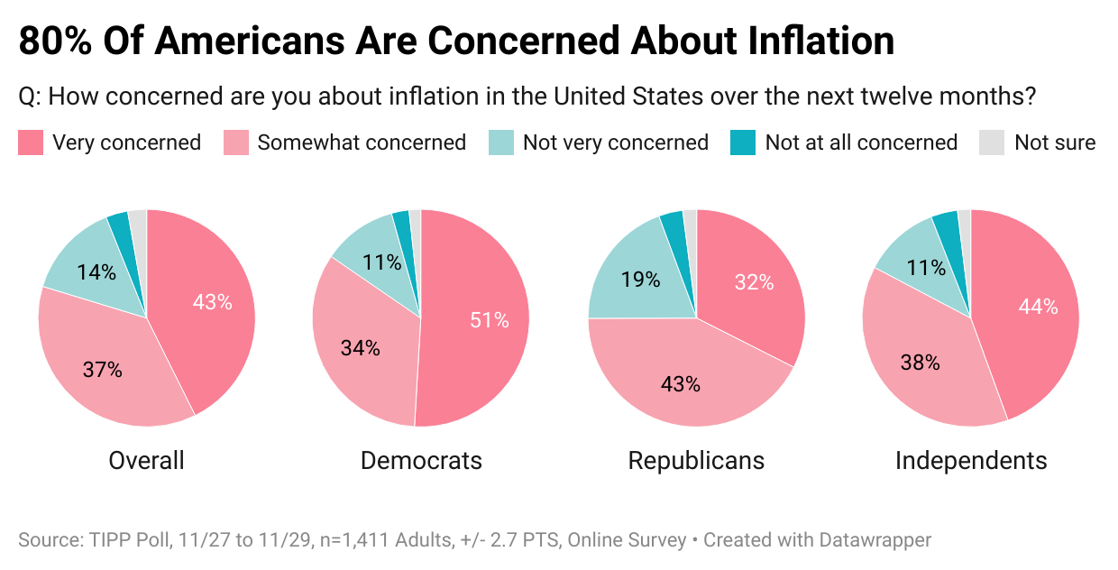 The survey showed that 80% are worried about inflation. One-half (43%) are very concerned, and another 37% are somewhat concerned.