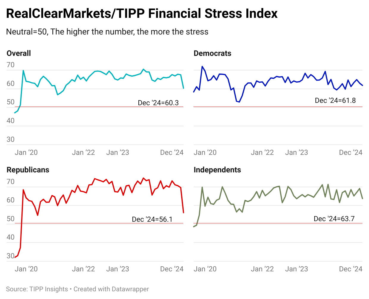 RCM/TIPP also releases our companion index, known as the RCM/TIPP Financial-Related Stress Index, the only metric to track the financial stress felt by Americans monthly. The index improved 7.2 points, or 10.7%, from 67.5 in November to 60.3 in December. The higher the number, the more stress. Readings above 50 signal increased stress, while those below 50 indicate lower stress, with 50 considered neutral.