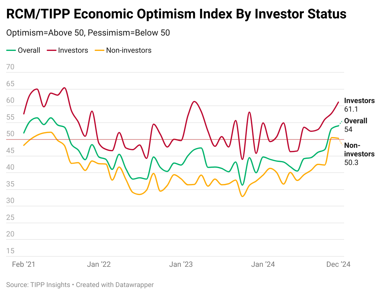 Investor optimism rose by 5.7%, climbing from 57.8 in November to 61.1 in December, while non-investors decreased slightly by 0.4%, from 50.5 to 50.3. The economic optimism gap between investors and non-investors widened to 10.8 points in December, up from 7.3 in November, 13.6 in October, and 10.4 in September.