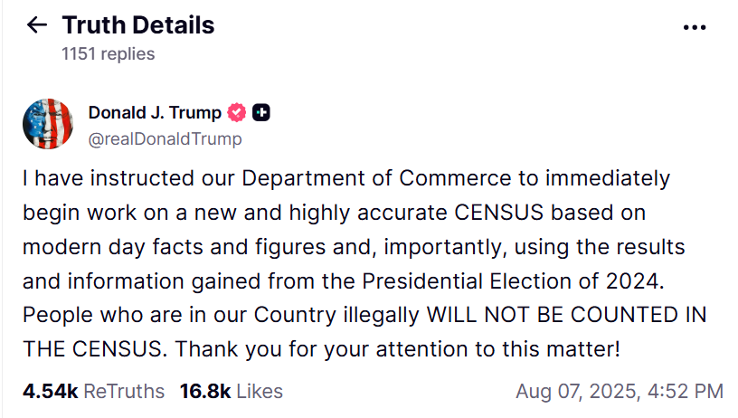In a Truth Social post, Trump said the revised census would reflect "modern day facts" and draw from 2024 election data. He declared, "People who are in our Country illegally WILL NOT BE COUNTED IN THE CENSUS."