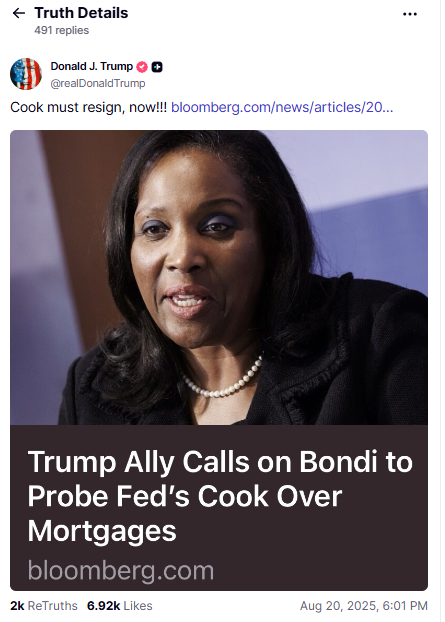 President Donald Trump has called for Federal Reserve Governor Lisa Cook to resign following allegations of mortgage fraud.