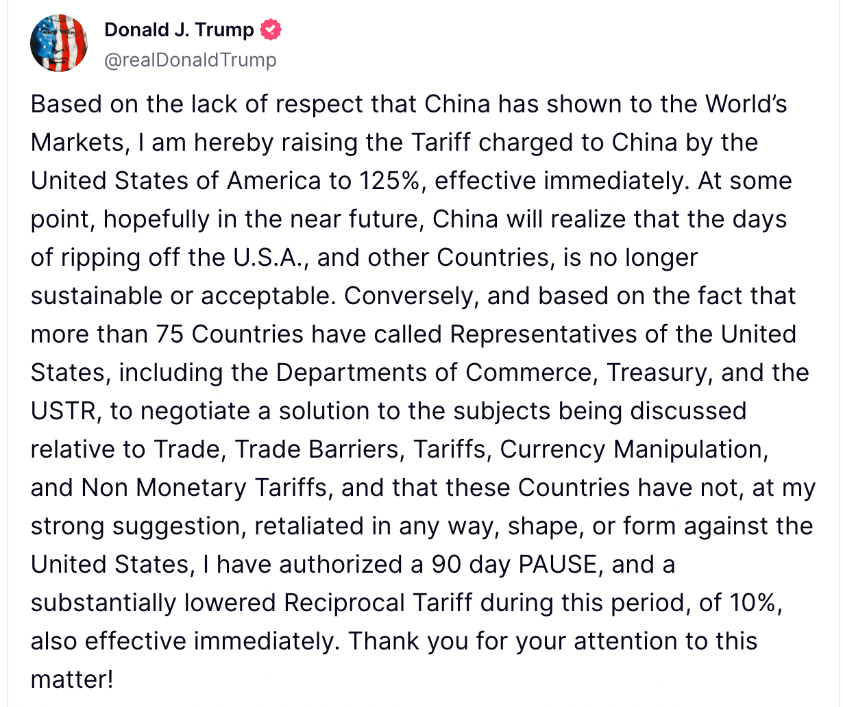 President Donald Trump announced a dramatic increase in tariffs on Chinese goods, raising the tariff rate to 125%, effective immediately. The move follows ongoing concerns over China's treatment of global markets and trade practices, with Trump stressing that China’s actions have been unsustainable and unacceptable. In a post on Truth Social, the President criticized China for “ripping off” the U.S. and other countries, signaling that such behavior would no longer be tolerated.