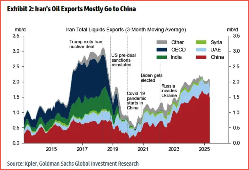 About 90% of Iran’s oil exports now go to China, often at discounts of $8 to $10 per barrel. That equals roughly 1.5 million barrels per day and represents a significant share of global seaborne crude. The discounted supply helps China lower import costs, but it also creates risk. Any disruption to Iranian exports or shipping through the Strait of Hormuz could tighten global markets and hit China’s energy supply first.