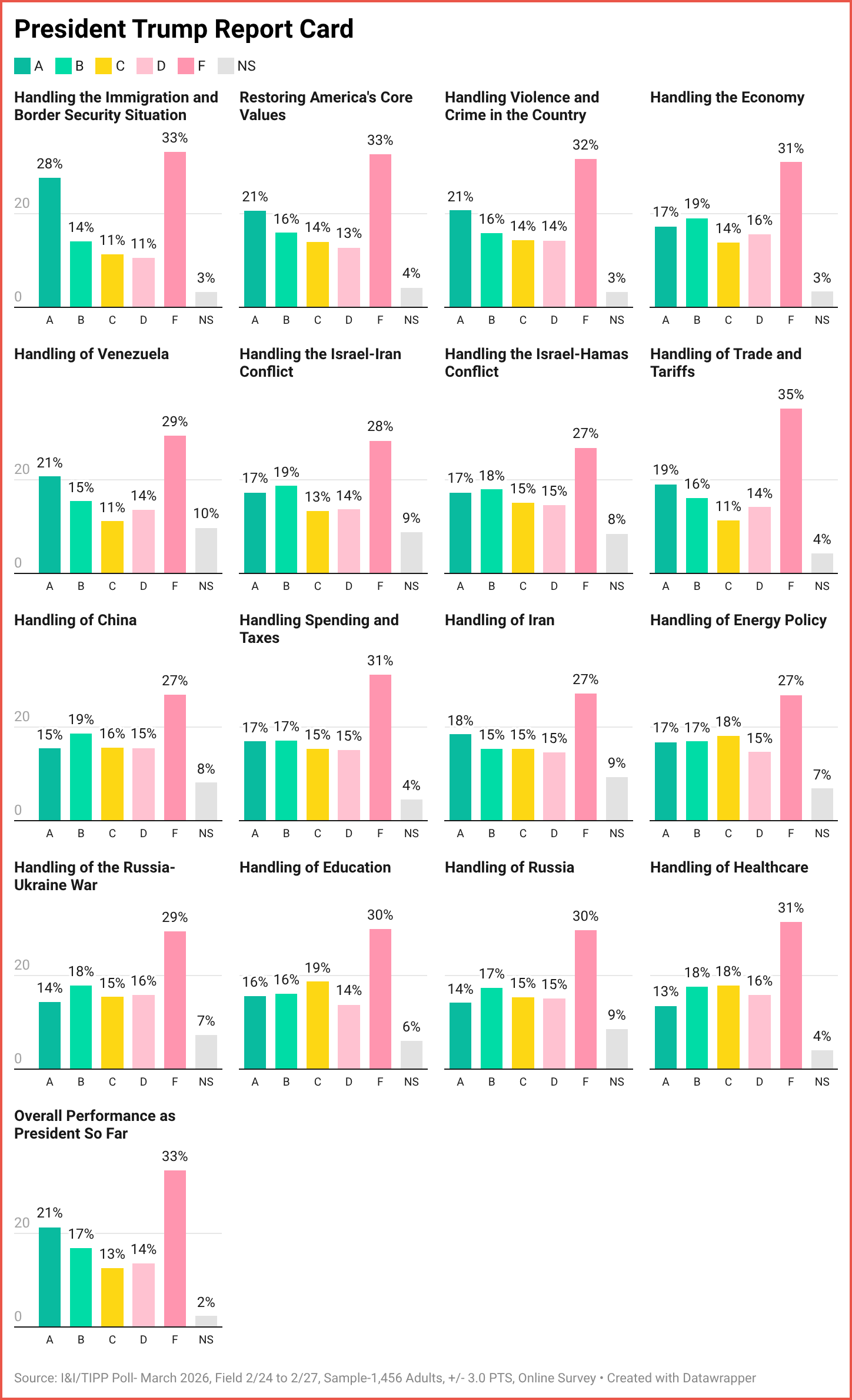 His highest score: 42% for "Handling the immigration, border security situation," followed by a number of 36% A and B scores for "Handling the economy," "Handling the Israel-Iran conflict," "Handling of Venezuela," "Handling violence and crime in the country," and "Restoring America's Core Values."