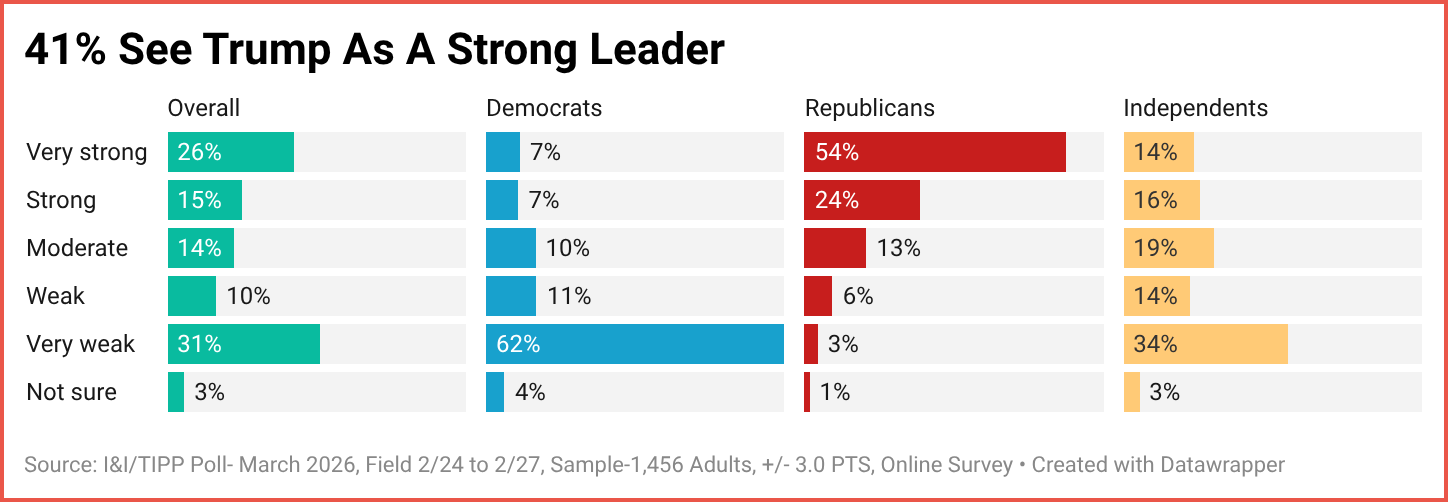 Overall, Trump's doing better in March with 55% calling his leadership either "very strong" (26%), "strong" (15%) or "moderate" (14%). But 41% called his leadership either "weak" (10%) or "very weak" (31%).