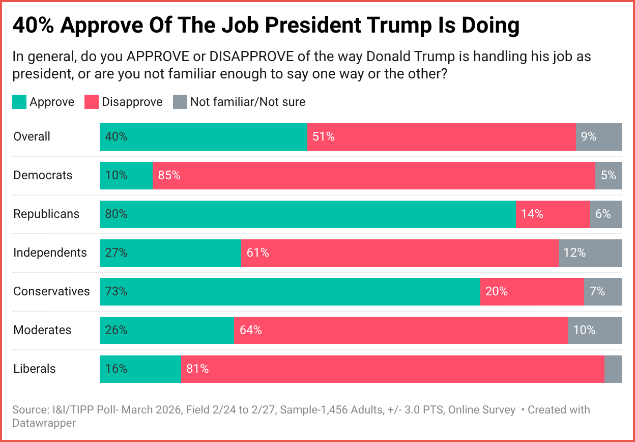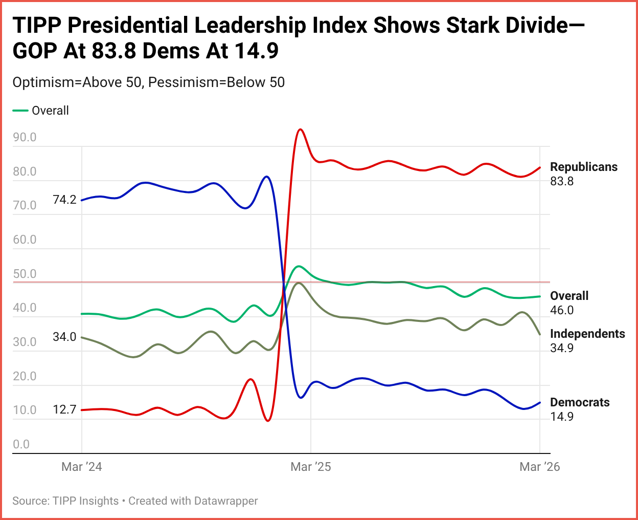 (Below: The TIPP Presidential Leadership Index measures public sentiment over time by combining three components: favorability, job approval, and presidential leadership. The index ranges from 0 to 100, with readings above 50 indicating optimism and below 50 signaling pessimism. In March, the overall index stood at 46.0 (Feb=45.6, Jan=46.3, Dec=48.4), with Republicans most optimistic at 83.8 (Feb=81.1, Jan=82.9, Dec=84.8), Democrats least at 14.9 (Feb=13.1, Jan=16.3, Dec 18.7), and independents in between at 34.9 (Feb=41.4, Jan=37.7, Dec=39.3).