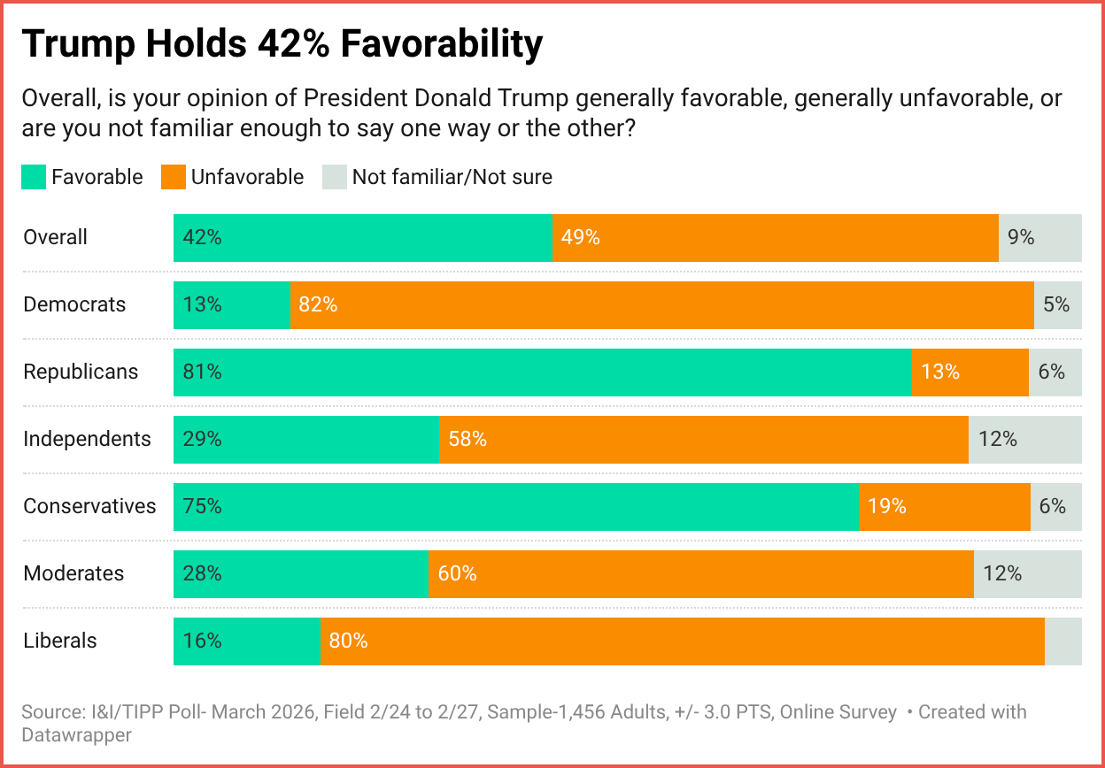 That's only marginally better than February's 41% favorable, 50% unfavorable rating, with a net of minus-9 percentage points.