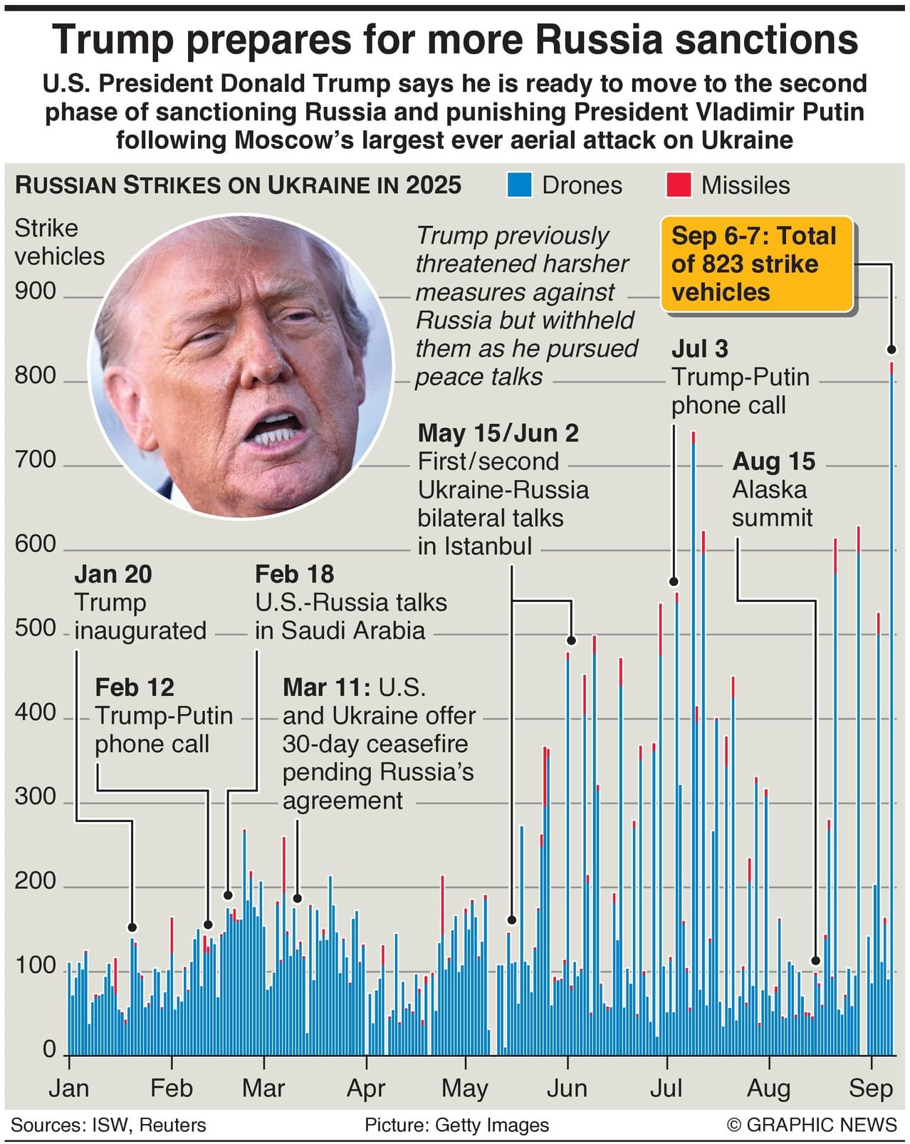 President Donald Trump says he is prepared to move to the second phase of sanctioning Russia following Moscow’s largest-ever aerial attack on Ukraine.
