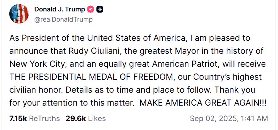 Trump praised Giuliani as “the greatest mayor in the history of New York City” and “an American patriot.” Giuliani, who led New York during the 9/11 terror attacks, has remained a close Trump ally, serving on an advisory council at the Department of Homeland Security and advising the White House on the 2026 FIFA World Cup.