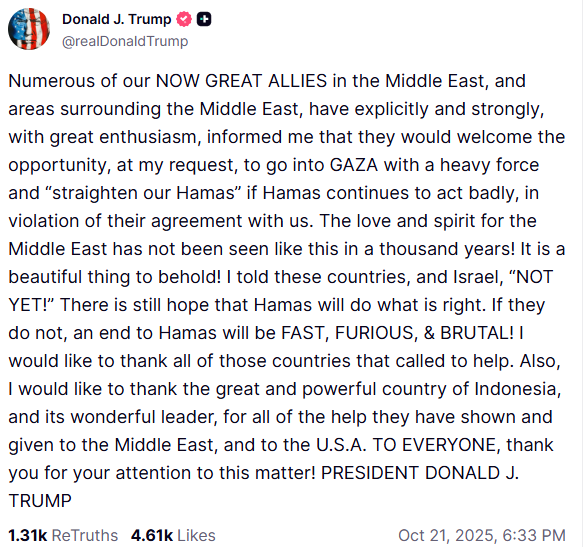 President Donald Trump said on Truth Social that several U.S. allies in and around the Middle East have offered to deploy forces into Gaza to “straighten out Hamas” if the militant group violates its ceasefire agreement.