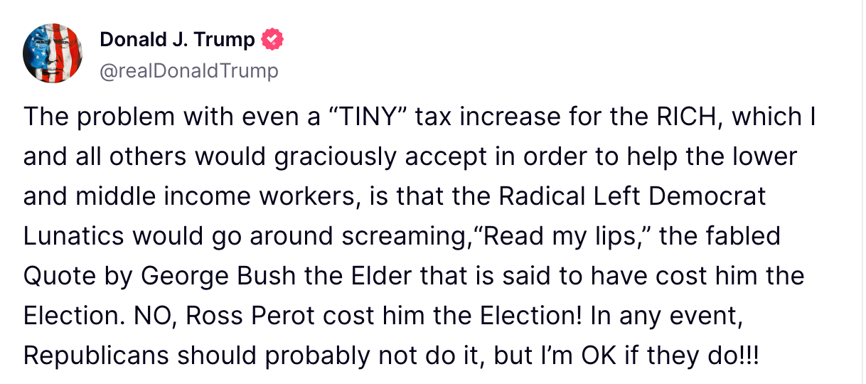 President Donald Trump said he is “Ok” with Republicans raising taxes on the wealthy, though he warned it could backfire politically. In a Truth Social post, Trump wrote: “Republicans should probably not do it, but I’m ok if they do!!!” He added that even a small hike could be weaponized by Democrats, referencing former President George H. W. Bush’s infamous 1988 promise: “Read my lips: no new taxes.”