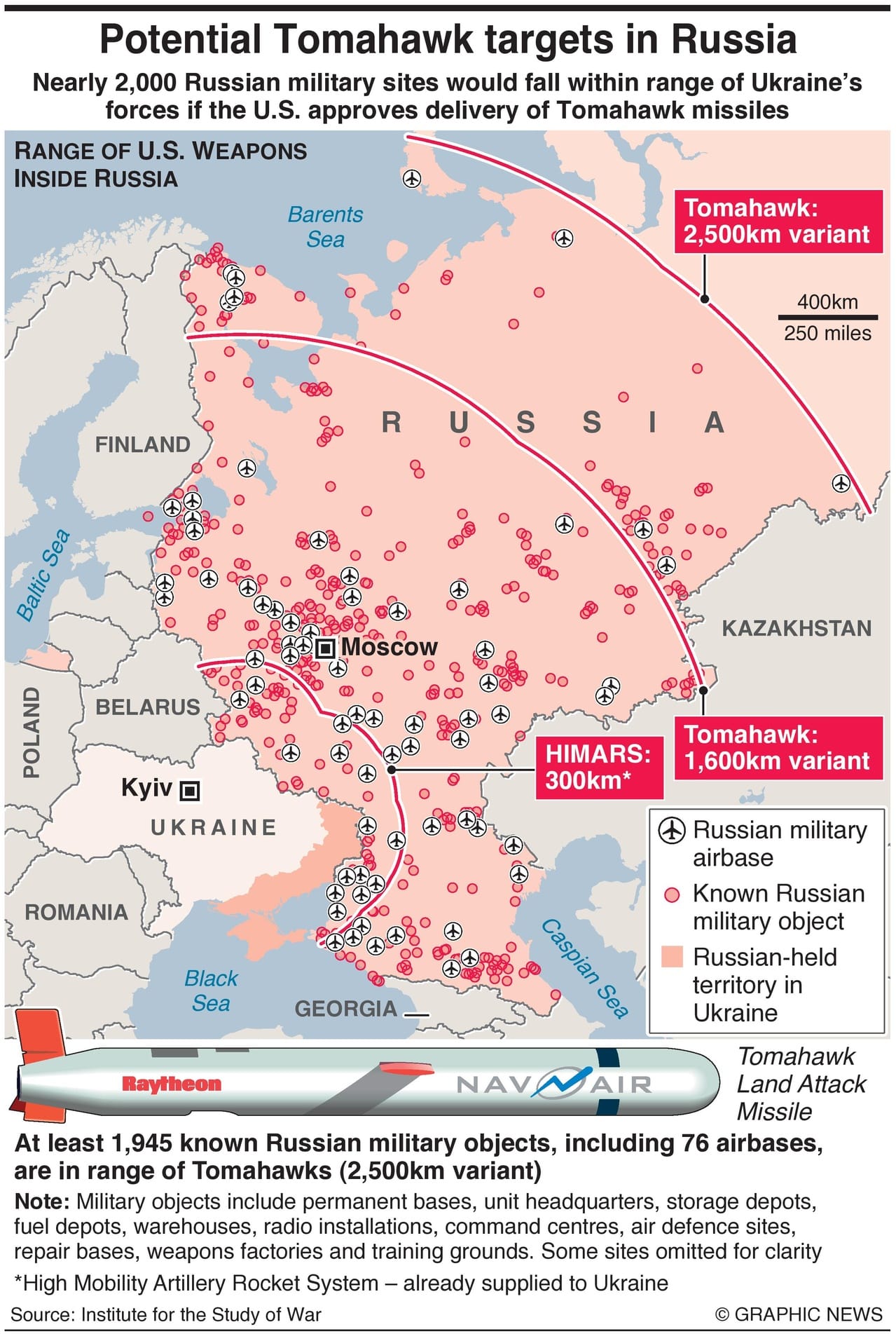 Nearly 2,000 Russian military sites would fall within range of Ukraine’s forces if the U.S. approves delivery of Tomahawk missiles, the Institute for the Study of War (ISW) says.