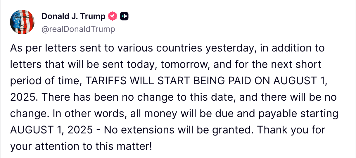 In a post on Truth Social Tuesday, Trump stated, “Tariffs will start being paid on August 1, 2025. There has been no change to this date, and there will be no change.” He emphasized that letters announcing the tariffs had already been sent to multiple countries and that more would follow in the coming days.