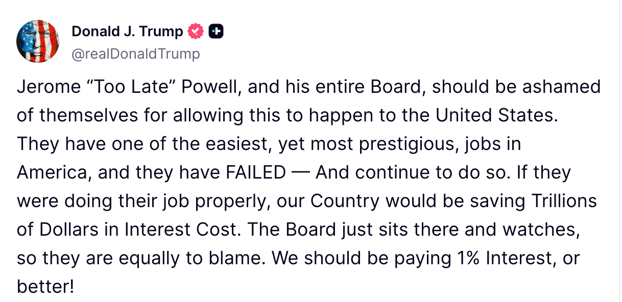 “Jerome ‘Too Late’ Powell, and his entire Board, should be ashamed of themselves,” Trump wrote. “They have one of the easiest, yet most prestigious, jobs in America, and they have failed.”