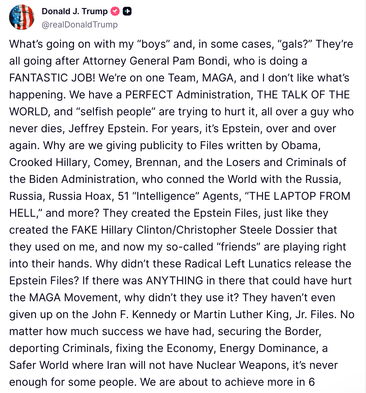 “Let Pam Bondi do her job,” Trump wrote on Truth Social, pushing back on critics who accuse her of misleading the public about Jeffrey Epstein’s death and alleged “client list.”