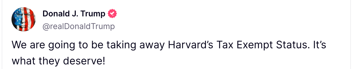 President Donald Trump announced on Truth Social that his administration will move to revoke Harvard University’s tax-exempt status, declaring, “It’s what they deserve!” While Trump did not elaborate on the reasoning behind the decision, it comes amid ongoing Republican criticism of elite universities over political bias, antisemitism controversies, and use of federal funding.