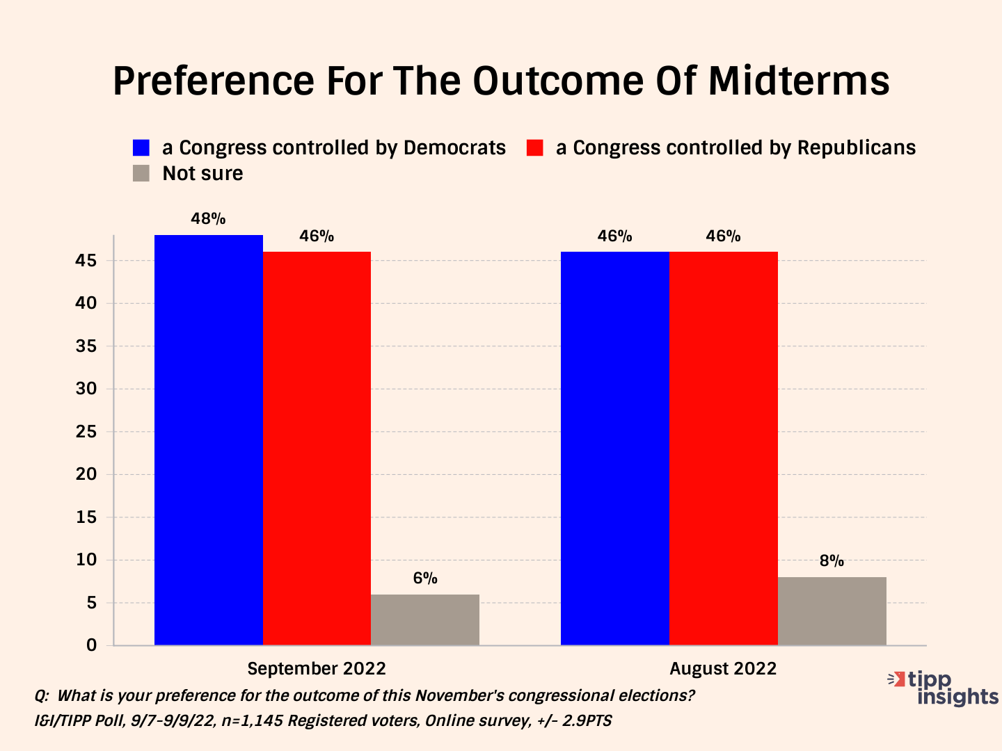 In September, 48% said they would prefer Congress controlled by the Democrats, compared to 46% for the Republicans. With a +/-2.9 point margin of error, that's essentially a tossup. In August, the comparable numbers were tied, 46% to 46%.